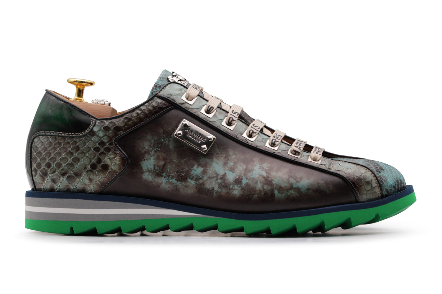 Made of crocodile effect printed veal, this Harris sneaker expresses a decisive and exclusive character. The details in lateral suede, combined with the tip and tab finished with silver touches, enrich the upper with sophisticated contrasts. The python leather heel with silver finish gives character while the Harris accessories in nickel and the Runner rubber sole complete the shoe with comfort and elegance.