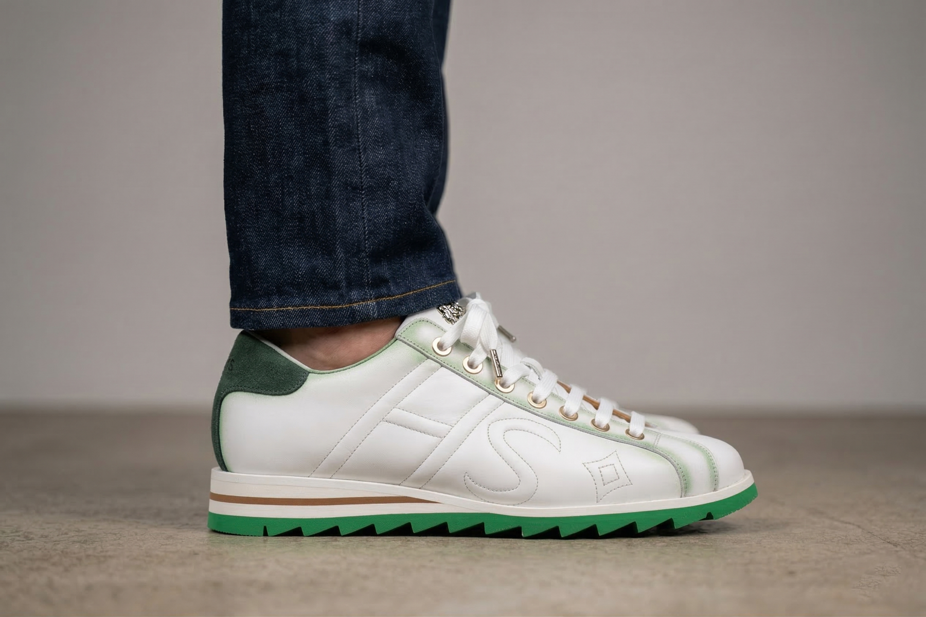 Essential and sophisticated, this shoe in white full-grain calfskin stands out for its green suede details, shaded with craftsmanship. The hand-shaded lacing demonstrates obsessive attention to detail, completed by the practicality of a high-quality runner sole.