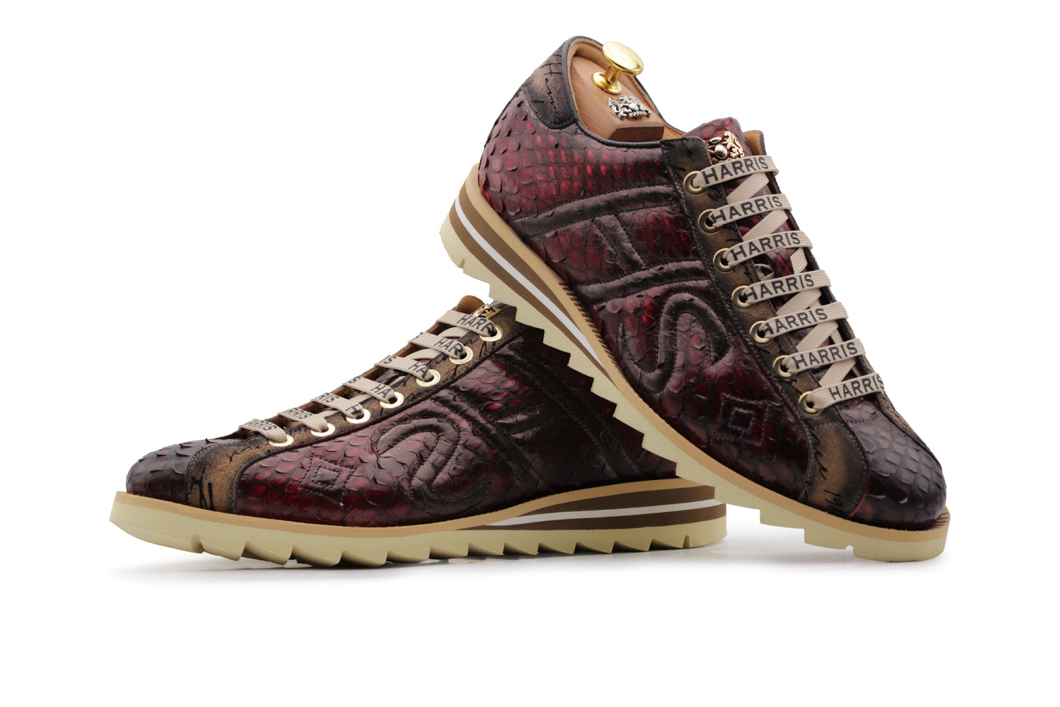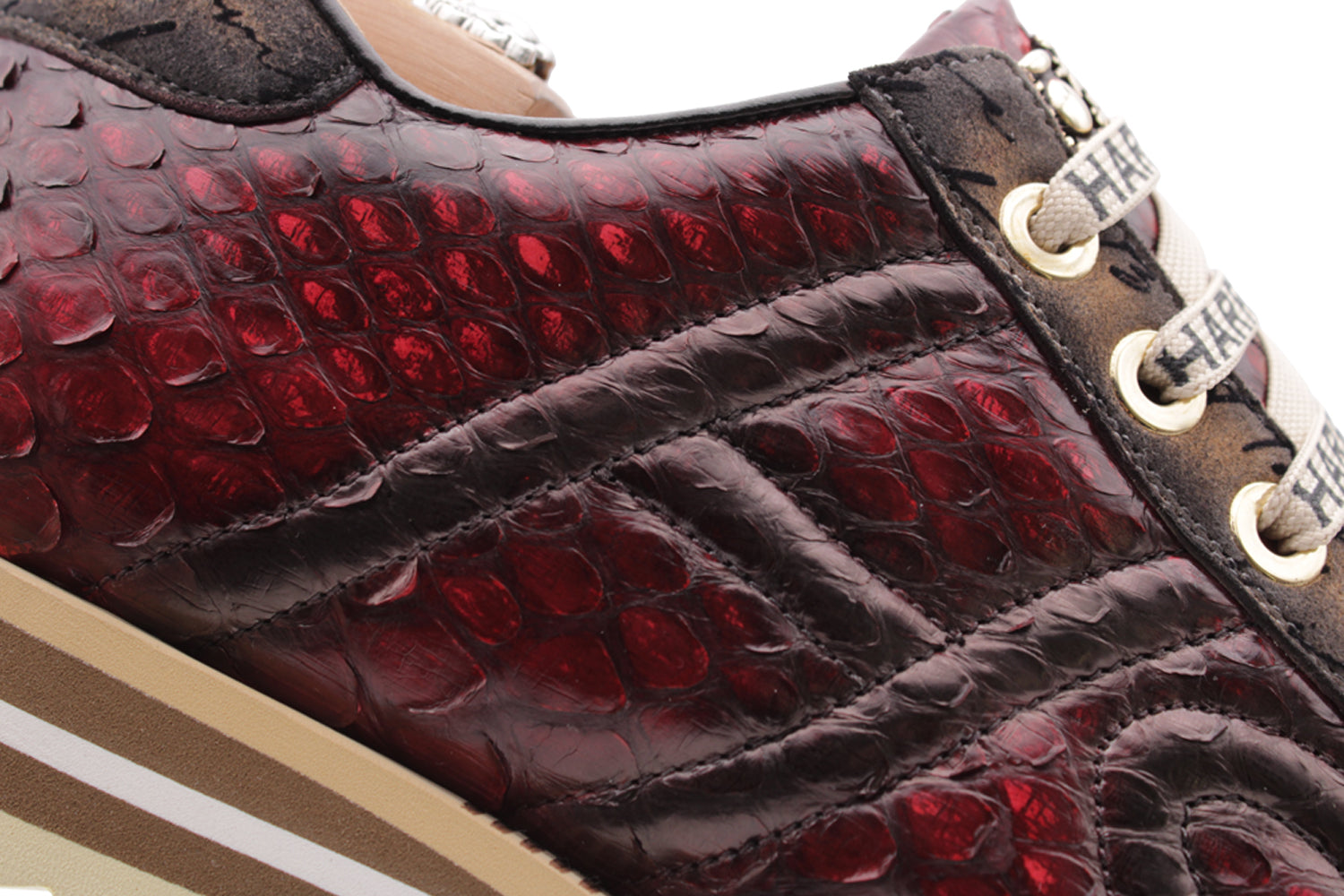 Fine hand-shaded English red python meets suede with beige "Writer" print. The shaded details and runner sole create a one-of-a-kind item.