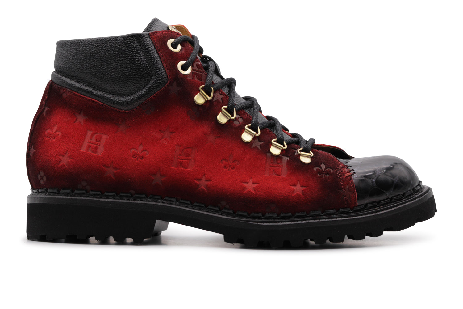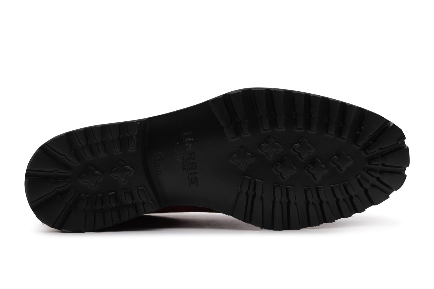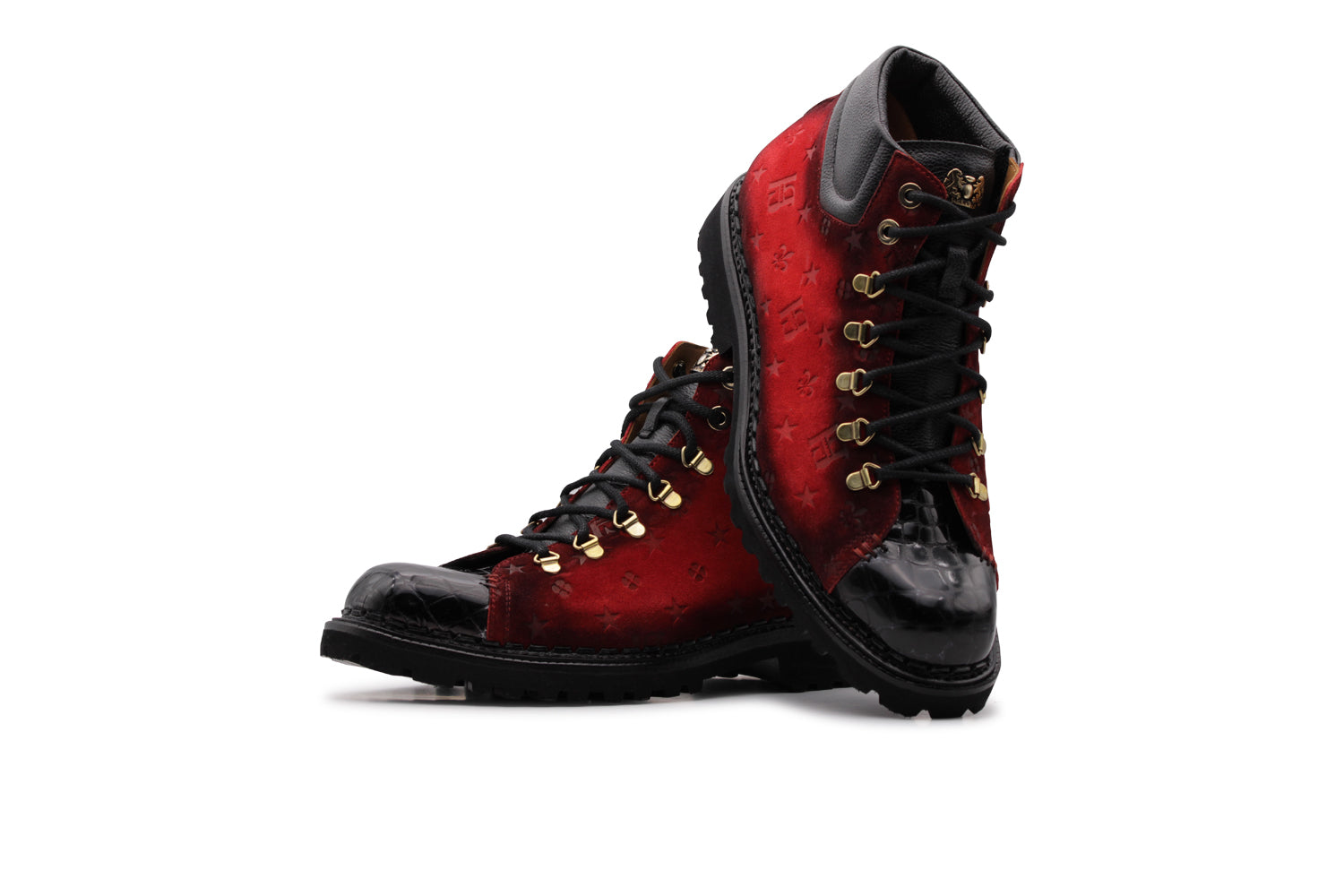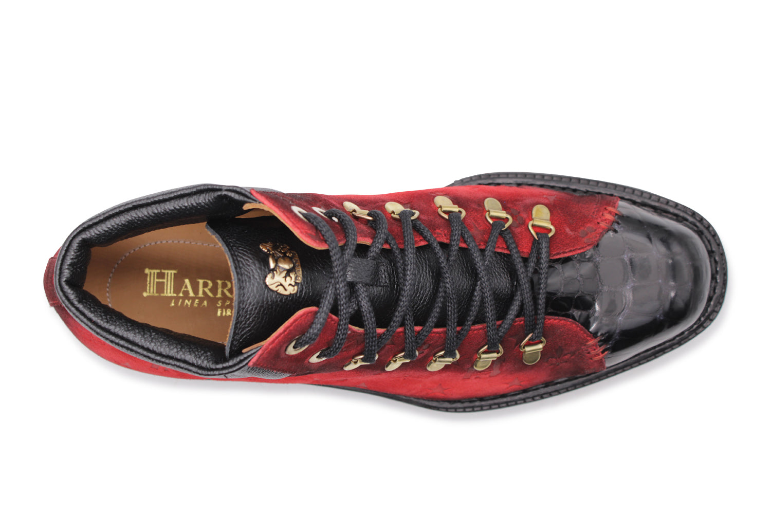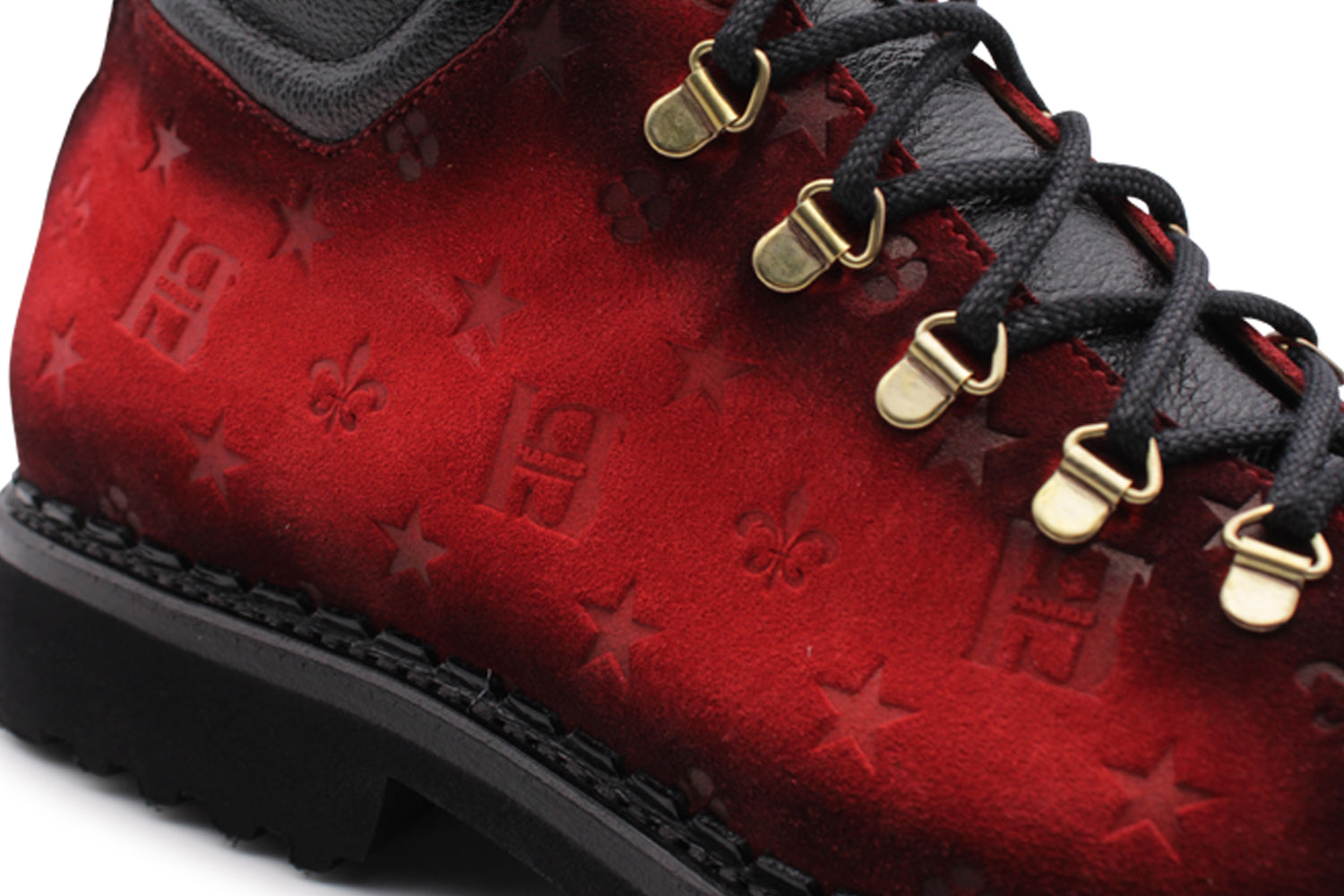 Questo polacchino è realizzato in suede rosso di alta qualità, impreziosito dalla stampa Harris Monogram e da sfumature realizzate a mano che ne esaltano l’artigianalità. I dettagli in pelle nera effetto coccodrillo donano carattere al modello, mentre la suola in gomma carrarmato assicura comfort e resistenza.