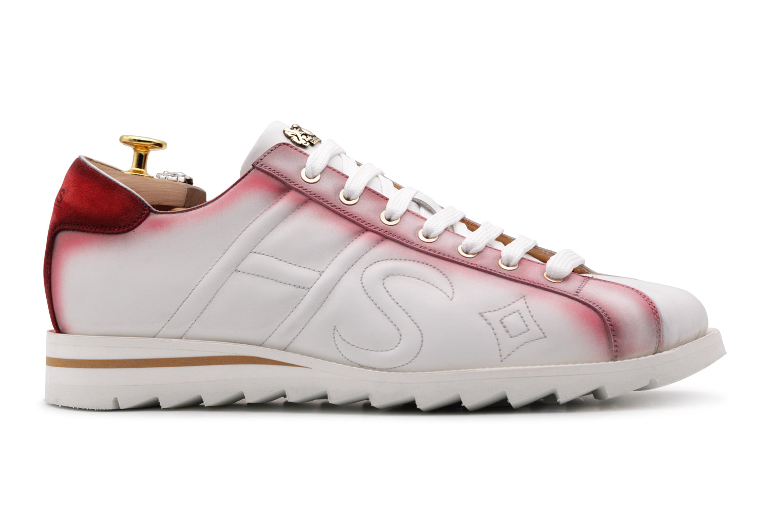 Vollnarbiges Kalbsleder, handbemalt mit fachmännischer Handwerkskunst, ergänzt durch kontrastierende dunkle Details. Ein vielseitiger und hochwertiger Sneaker.
