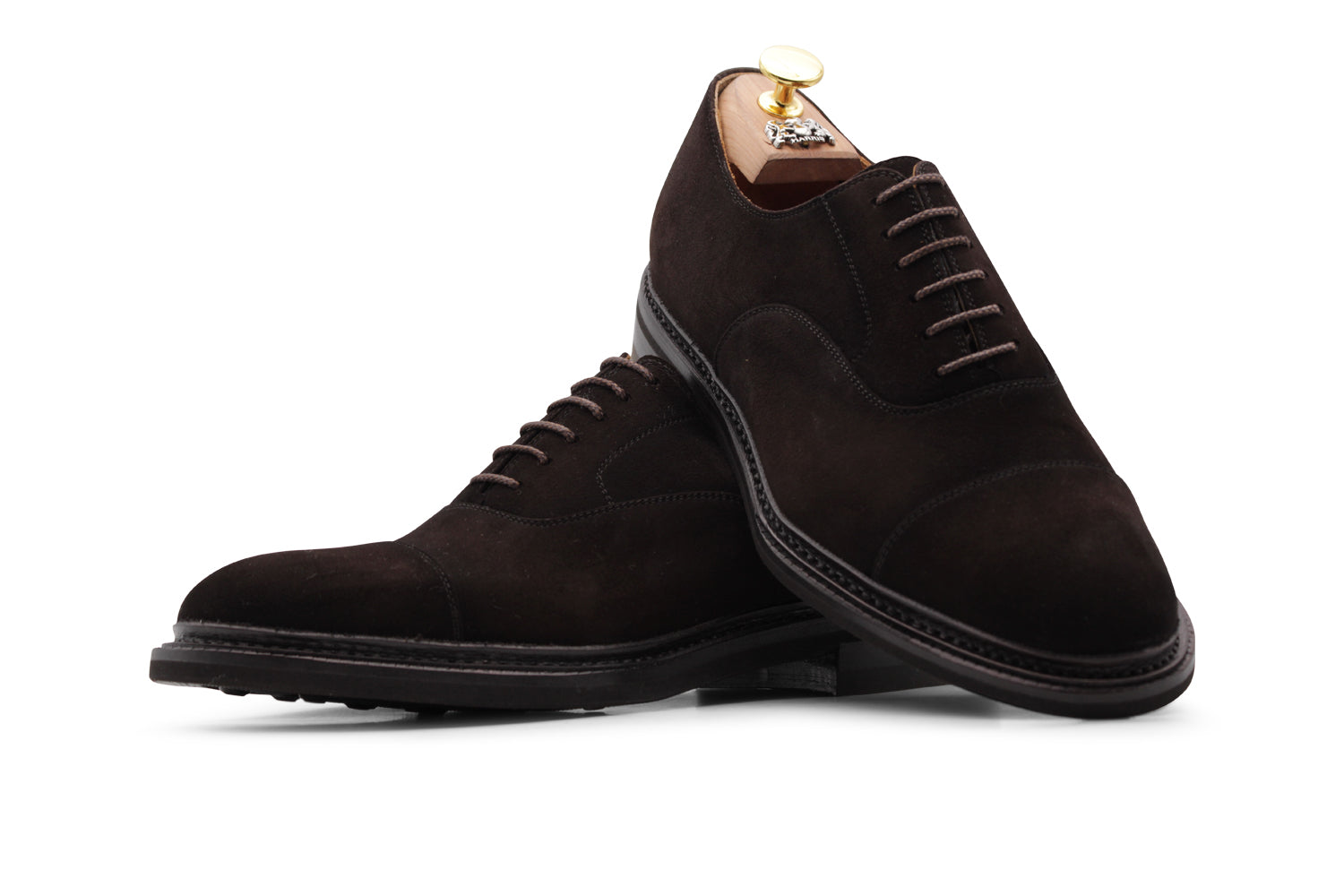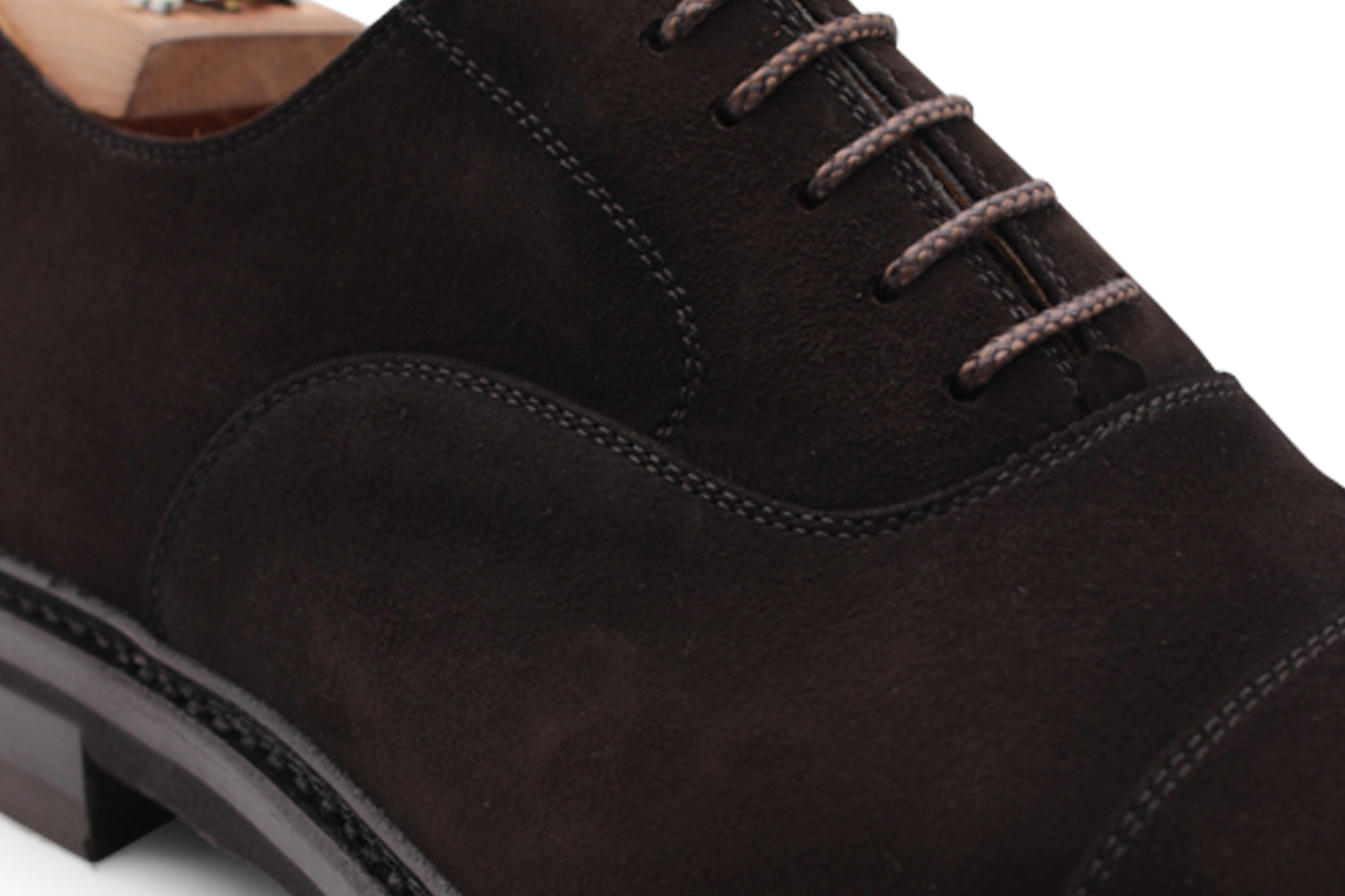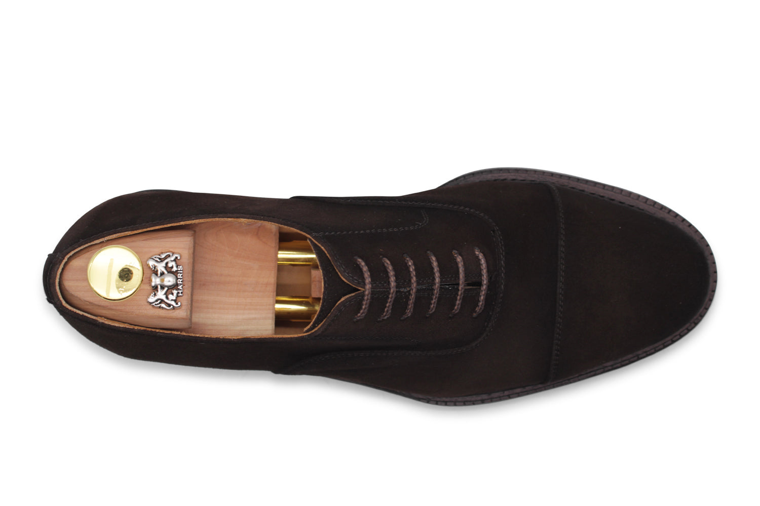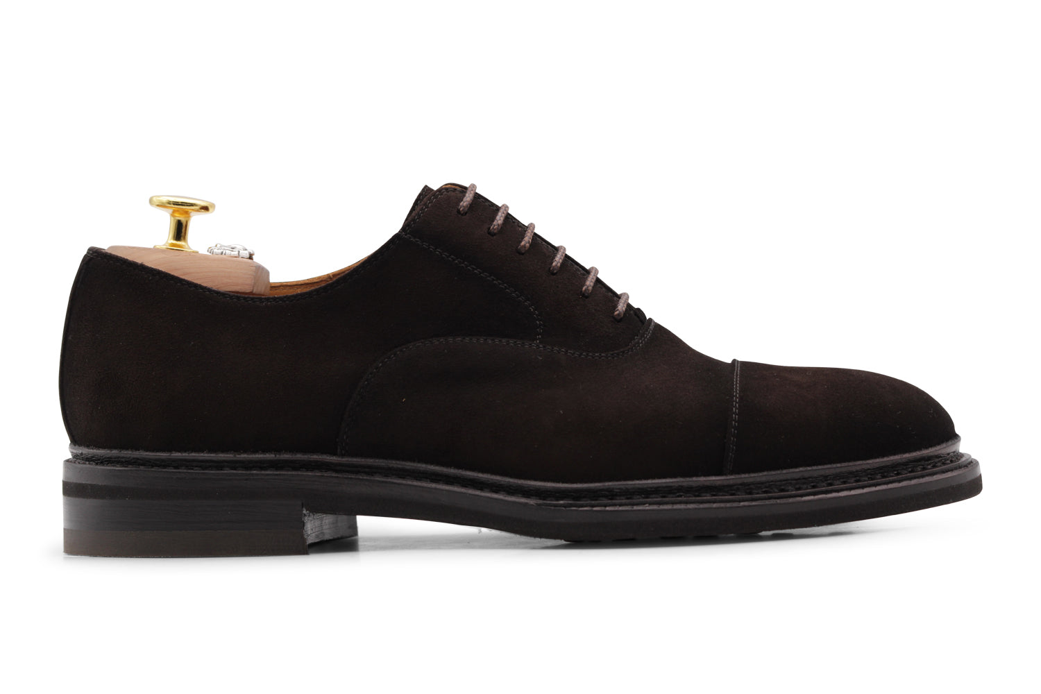 Francesina in suede color testa di moro con sfumature scure artigianali. La suola Dainite, il guardolo cucito e la lavorazione Blake Rapid assicurano stabilità e comfort per tutta la giornata.