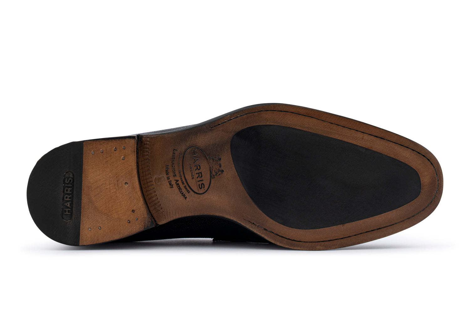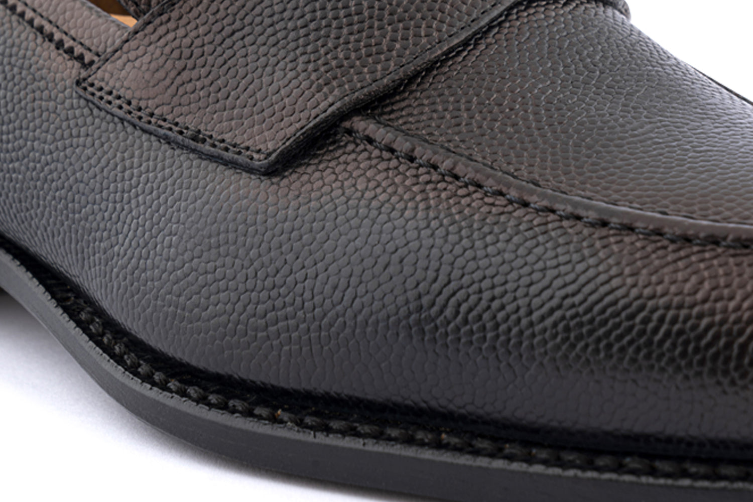 Realizzato in pelle pieno fiore stampata chicco di riso, questo mocassino dipinto a mano unisce blu scuro e neri per creare un effetto raffinato. Il passante in pelle e la lavorazione Blake Rapid esprimono un’eleganza discreta e autentica mentre la suola in cuoio con inserto antiscivolo garantisce comfort e sostegno.
