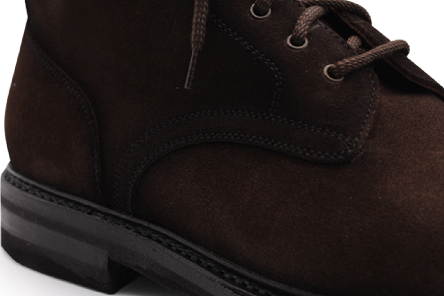 Piel de ante Testa di Moro con cortinas hechas a mano. El ribete cosido y la suela Dainite brindan durabilidad y comodidad, mientras que la construcción Blake Rapid refleja la artesanía de Harris.