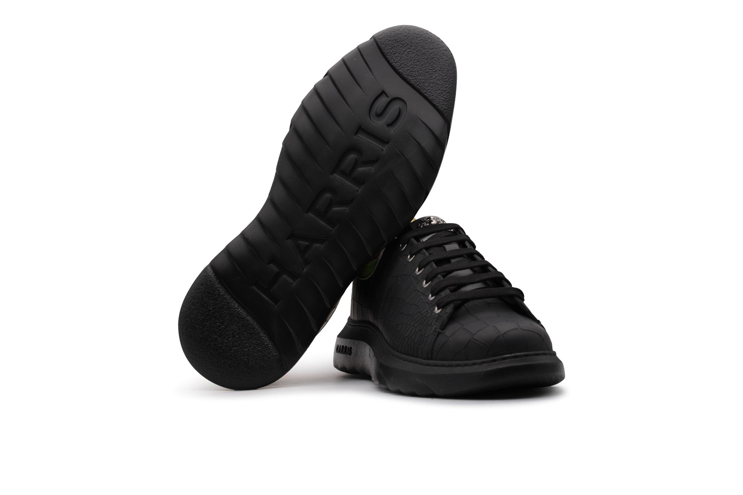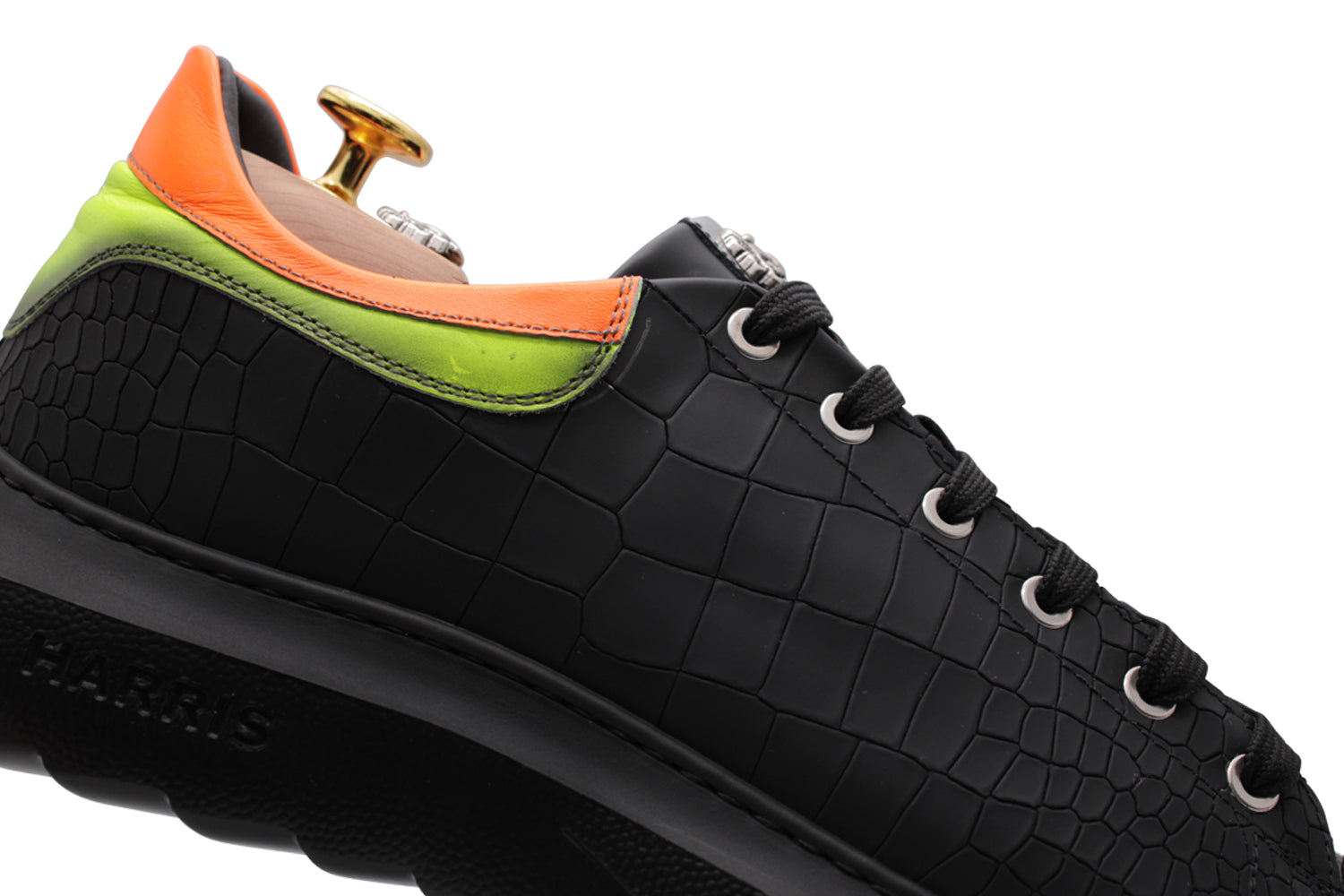 A bold contrast. Crocodile-effect printed leather meets fluorescent brushed leather details for a box rubber sneaker with an urban-luxury character.