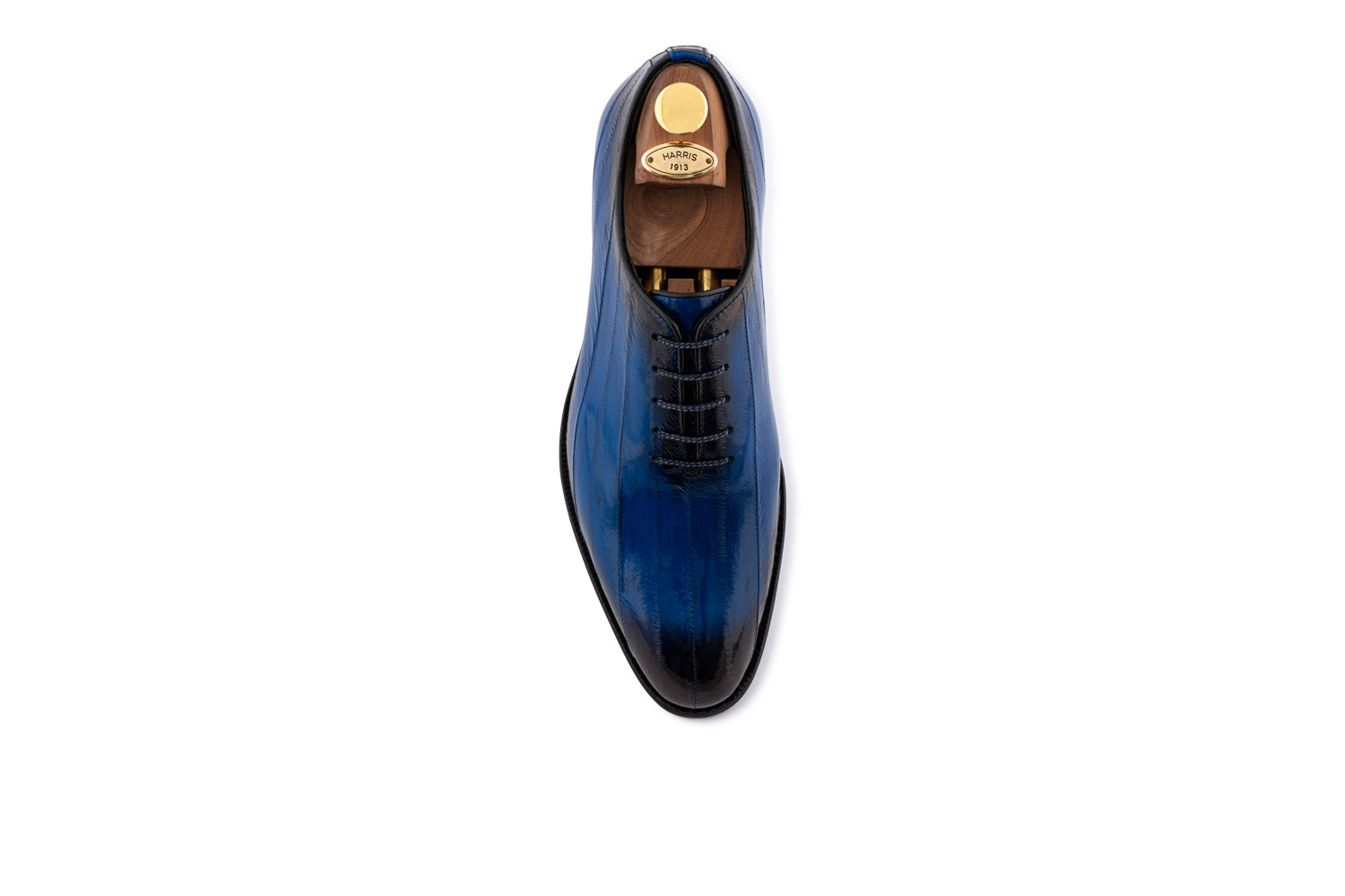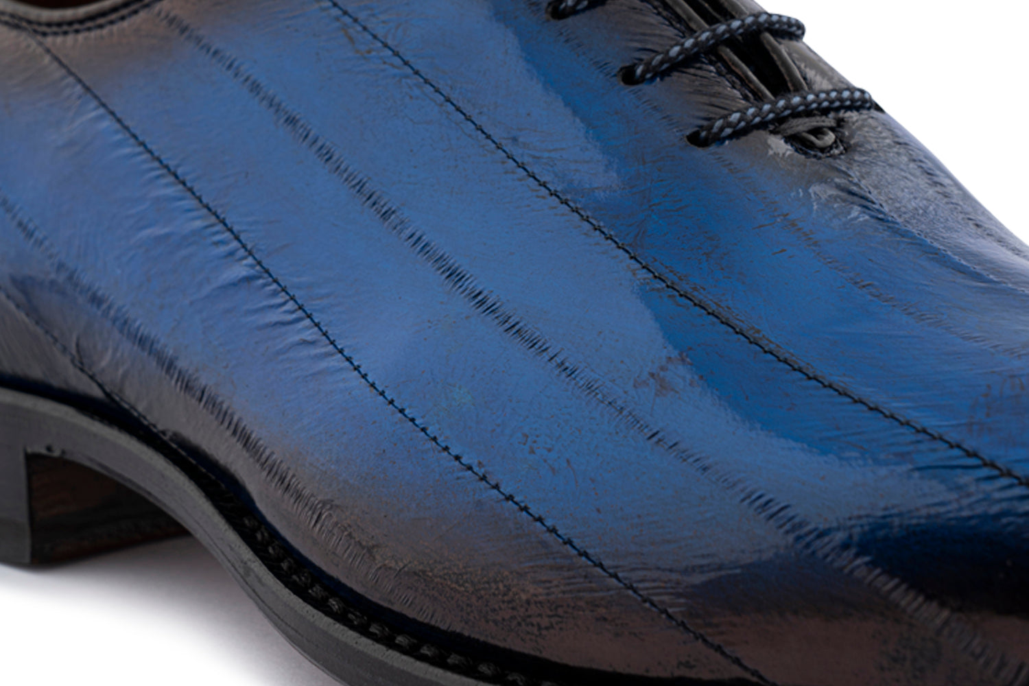 Realizzata in pelle di anguilla bluette e rifinita a mano con toni scuri e raffinati, questa francesina liscia esprime un’eleganza pura e contemporanea. La tomaia intera, priva di cuciture, mette in risalto la qualità della pelle e la maestria artigianale della lavorazione Blake Rapid mentre la suola in cuoio con inserto antiscivolo aggiunge praticità e comfort.