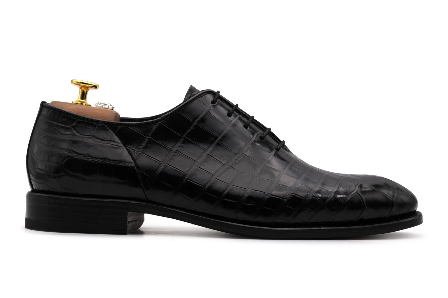 Double boucle en véritable crocodile noir brillant. La fabrication Blake Rapid et la semelle en cuir avec insert antidérapant définissent un modèle iconique et symbole de luxe absolu.