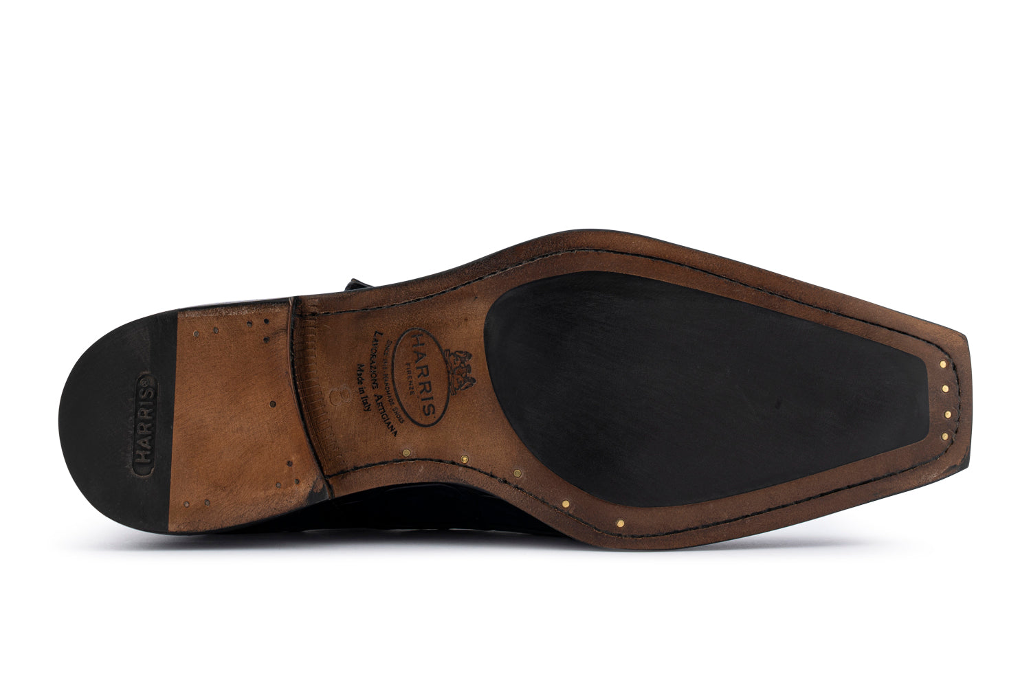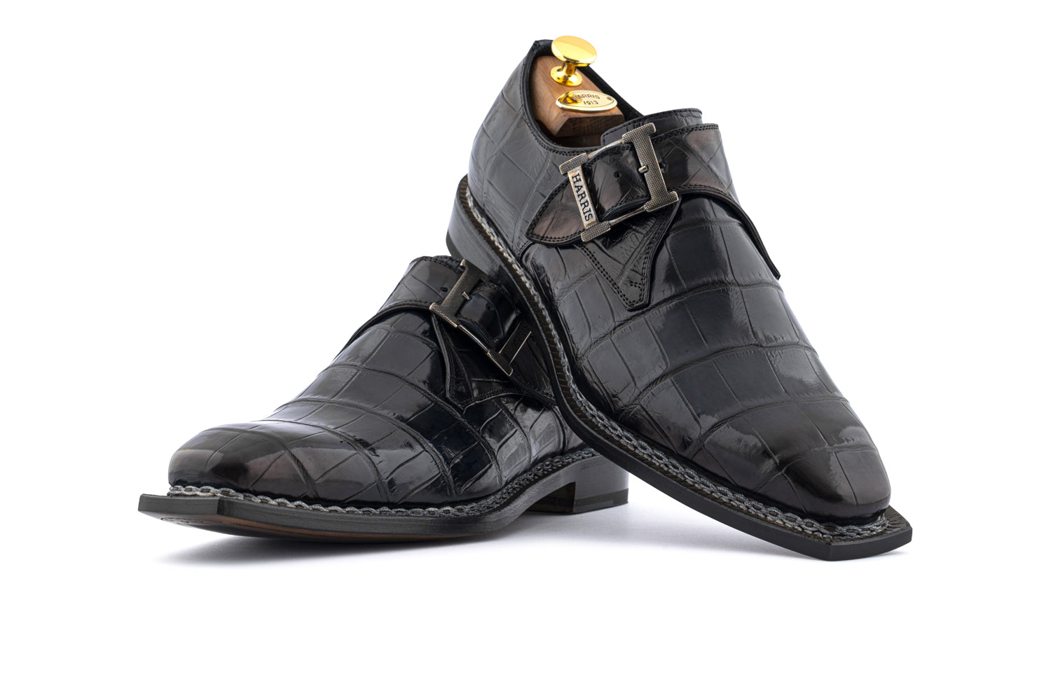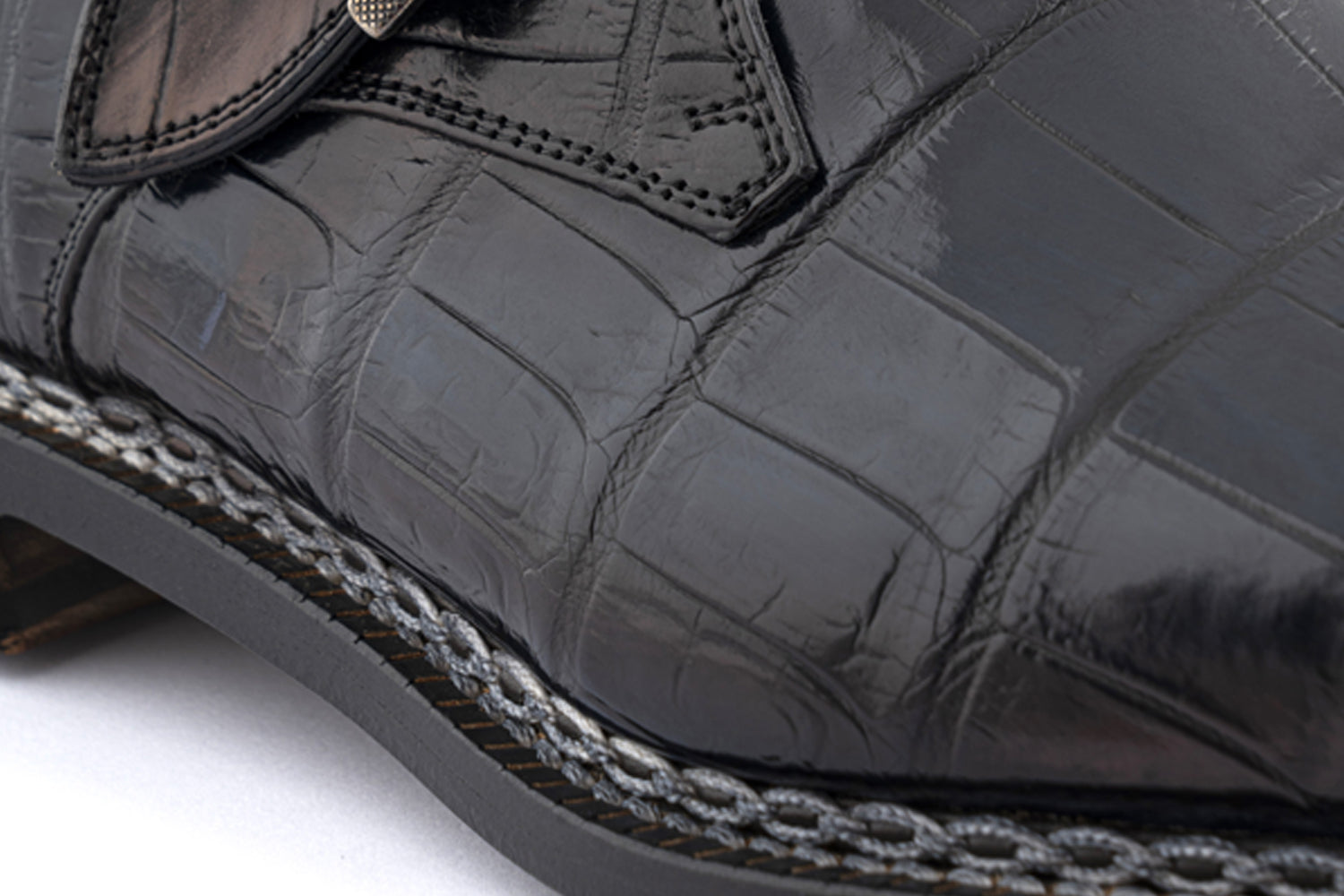 Elegante monofibbia realizzata in pelle di vero coccodrillo, dipinta a mano in una raffinata tonalità blu scuro sfumato nero. I dettagli valorizzano l’artigianalità del prodotto, frutto di una lavorazione norvegese di pregio che unisce tradizione e stile contemporaneo. Completa la calzatura una suola in cuoio che garantisce comfort, durata e un’eleganza senza tempo.