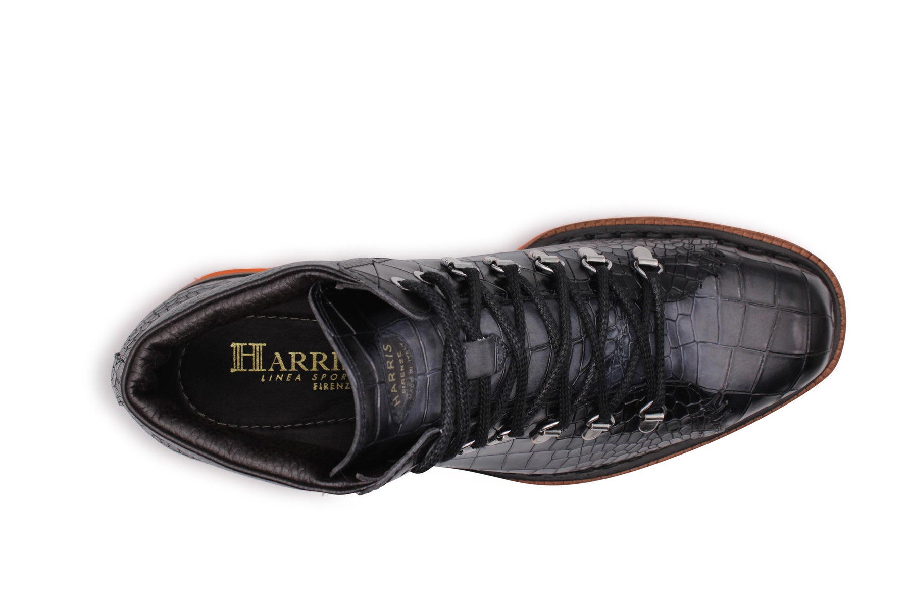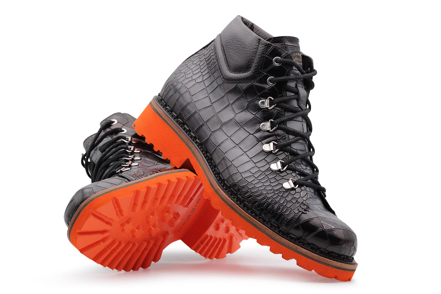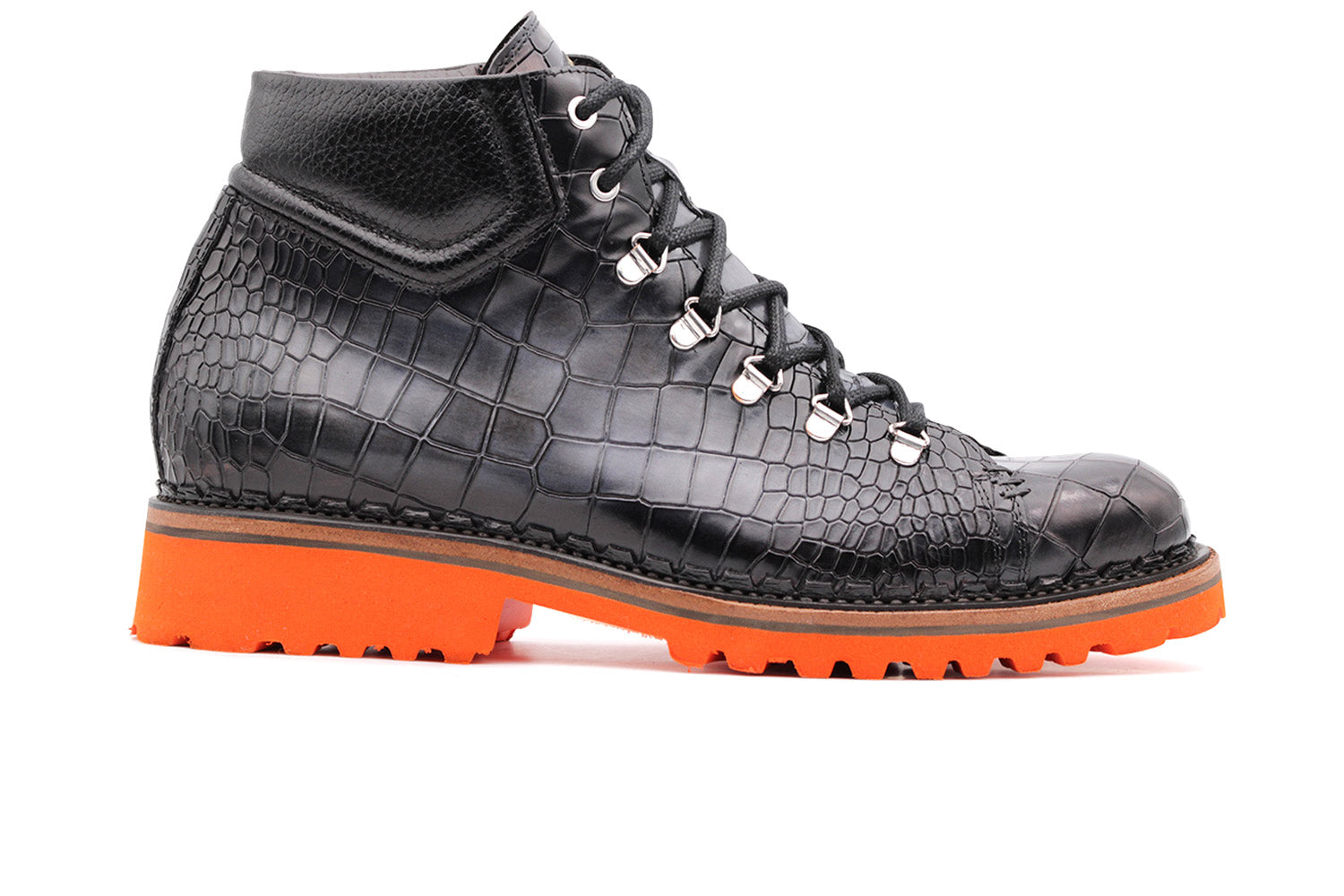 Boot de veau Crocodile de crocodile de douleur peinte et ombragée à la main. Un modèle inspiré par le trekking, réinterprété dans une clé artisanale. Caractérisé par les crochets métalliques pour le laçage, le cou avec un rembourrage rembourré et une pointe arrondie. Tap-dans la semelle du pneu contrastant. Fabriqué en Italie.