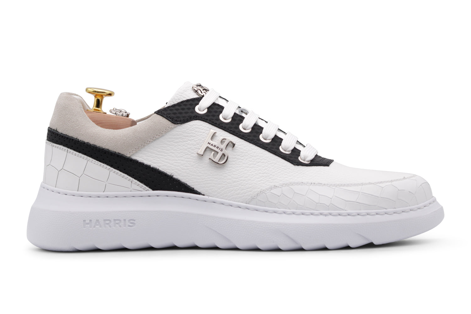 Realizzata con materiali pregiati, questa sneaker combina la preziosità della pelle di pitone beige con la morbidezza del suede beige, creando un contrasto elegante. Gli inserti in pelle pieno fiore bianca aggiungono luminosità e armonia al design. La suola Innovazione bianca assicura flessibilità e comfort superiori, mentre gli accessori oro e la piastrina Harris impreziosiscono il modello con dettagli distintivi. La fodera naturale garantisce una calzata impeccabile.