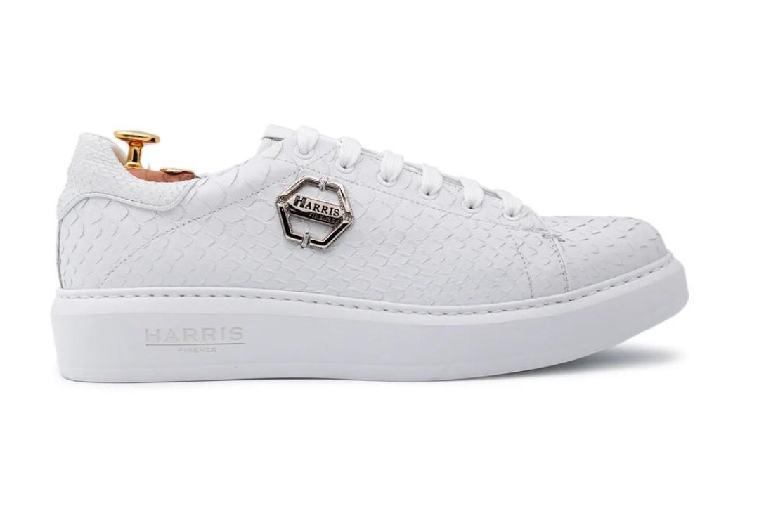 Sneaker dallo stile deciso e artigianalità superiore, realizzata in pelle di vitello pieno fiore e vera pelle di pitone, entrambe dipinte e tamponate a mano per un effetto unico e irripetibile. I dettagli in pelle spazzolata aggiungono profondità e carattere, mentre gli accessori in finitura nichel donano un tocco contemporaneo.
