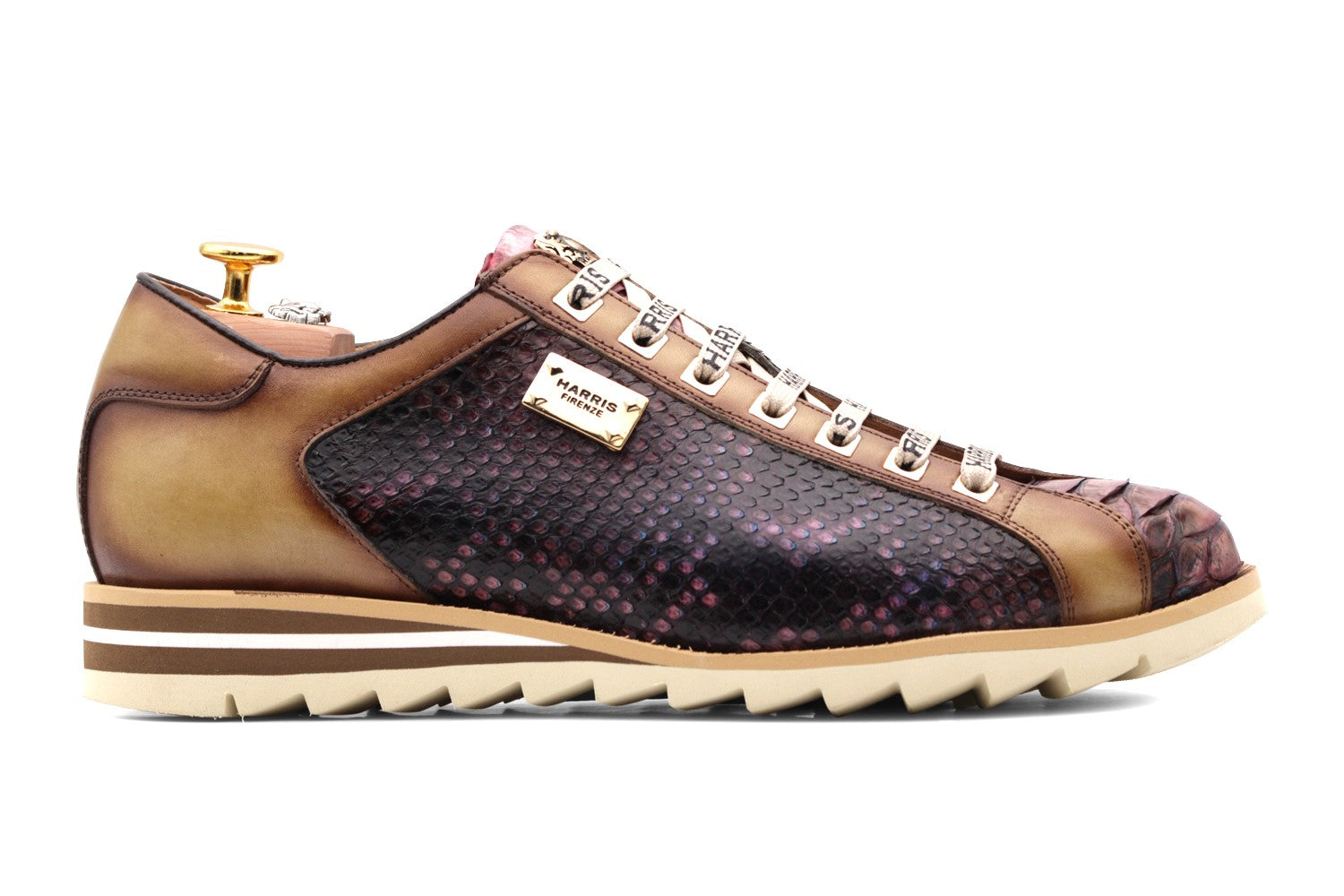 Eleganza e innovazione si incontrano in questa sneaker esclusiva, realizzata con pelle di vero pitone color roccia e pelle di vitello pieno fiore dipinta a mano. Ogni dettaglio è curato con maestria, creando un contrasto sofisticato e distintivo. La suola runner offre comfort e supporto ottimale, mentre il logo oro Harris aggiunge un tocco finale di lusso. Un capolavoro di artigianalità, pensato per chi cerca il massimo in ogni passo.