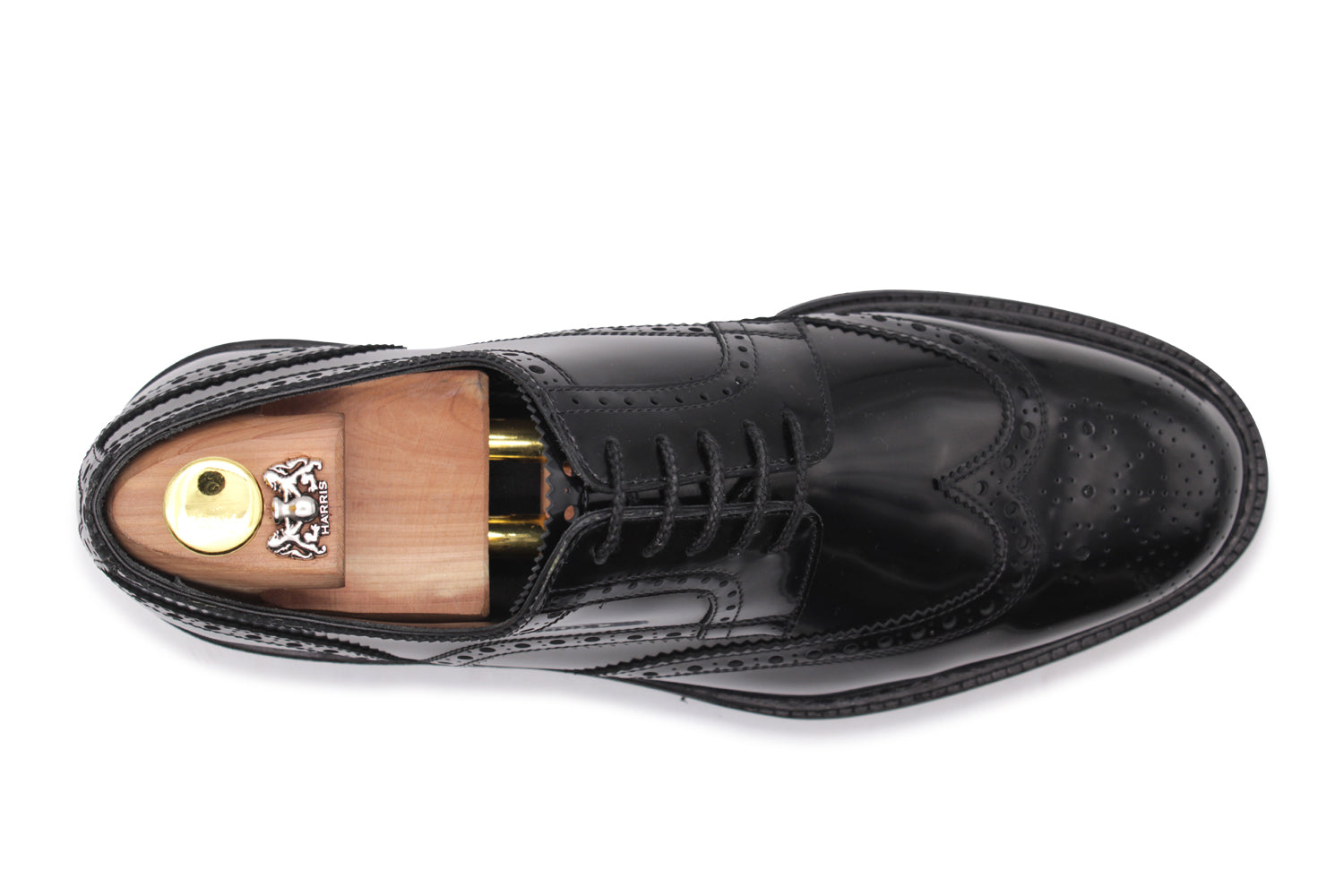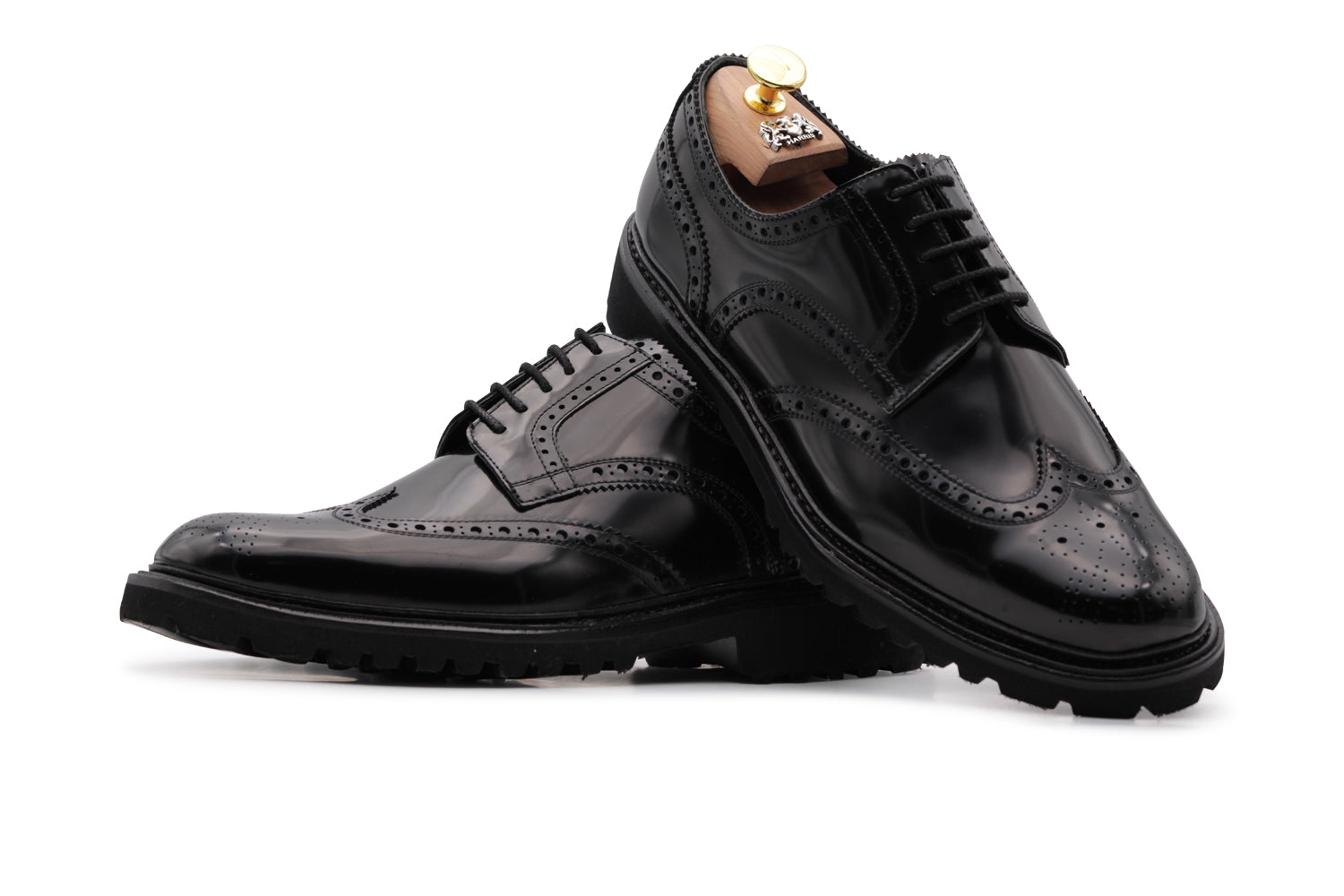 Derby in pelle spazzolata nera lucida, impreziosita da dettagli bragué e completata da una suola carrarmato in gomma. Il guardolo cucito e la lavorazione Blake Rapid creano un equilibrio perfetto tra eleganza formale e carattere urbano.