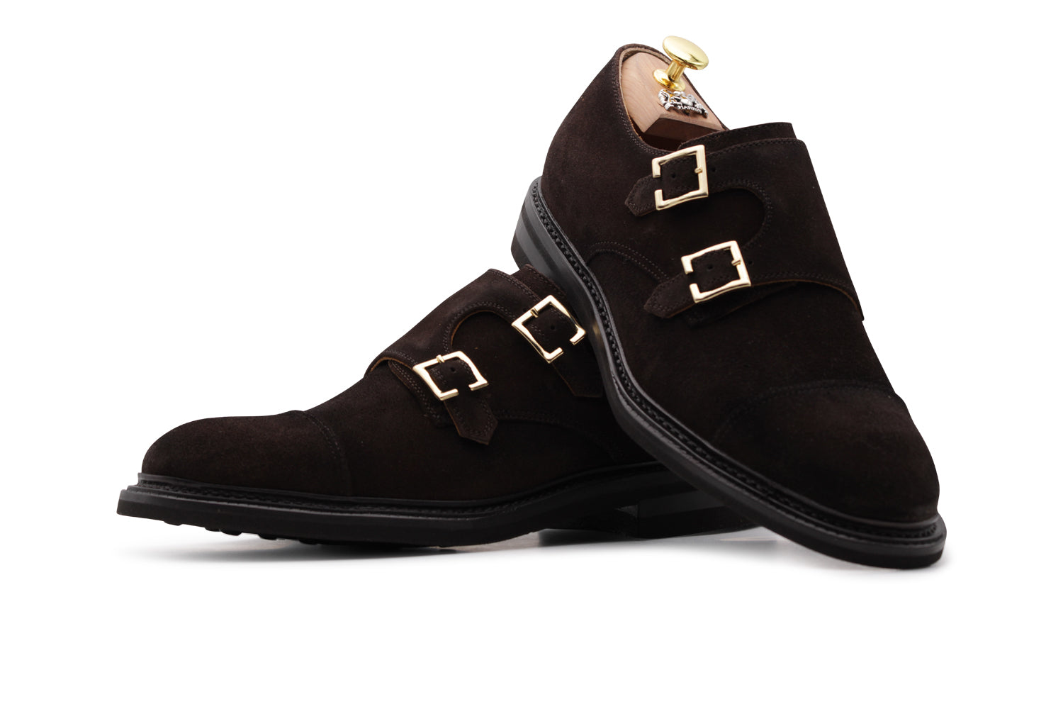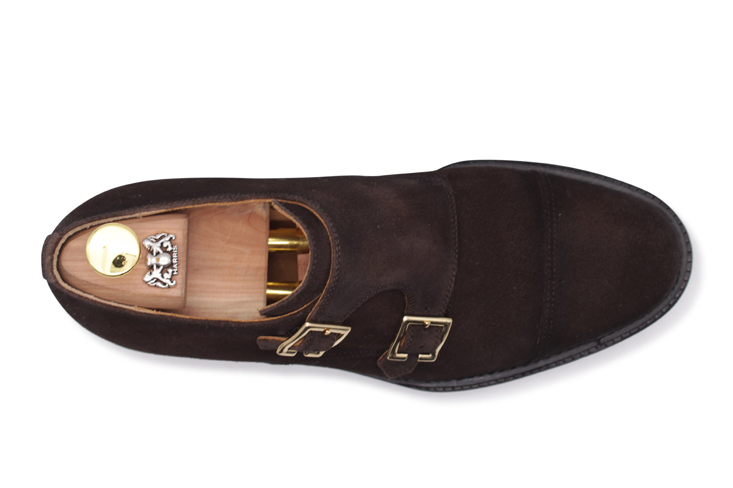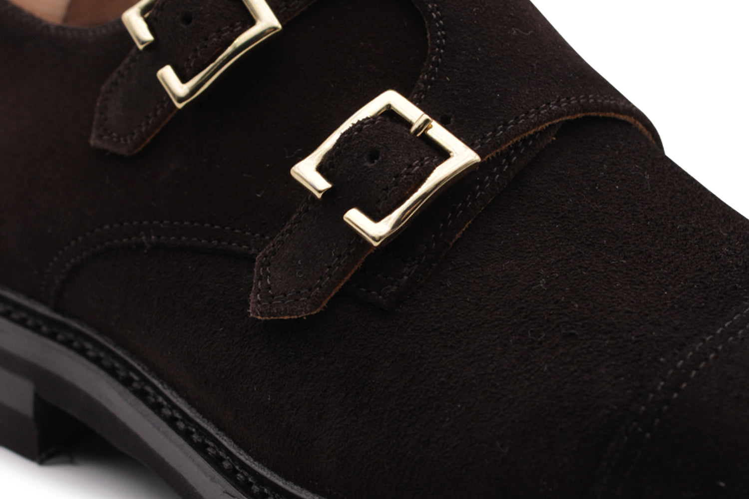 Doppia fibbia in suede testa di moro sfumata a mano