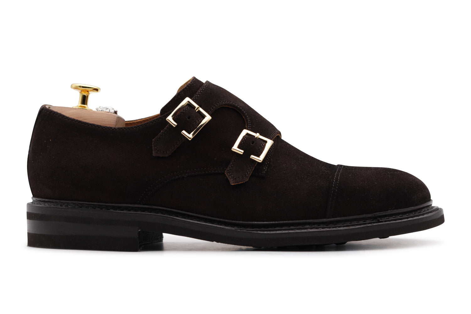 Questa doppia fibbia in pelle scamosciata color testa di moro, con sfumature scure realizzate a mano, esprime un’eleganza decisa e contemporanea. Le fibbie quadrate in finitura oro completano il design, mentre la suola in gomma con guardolo cucito assicura comfort e qualità artigianale Made in Italy.