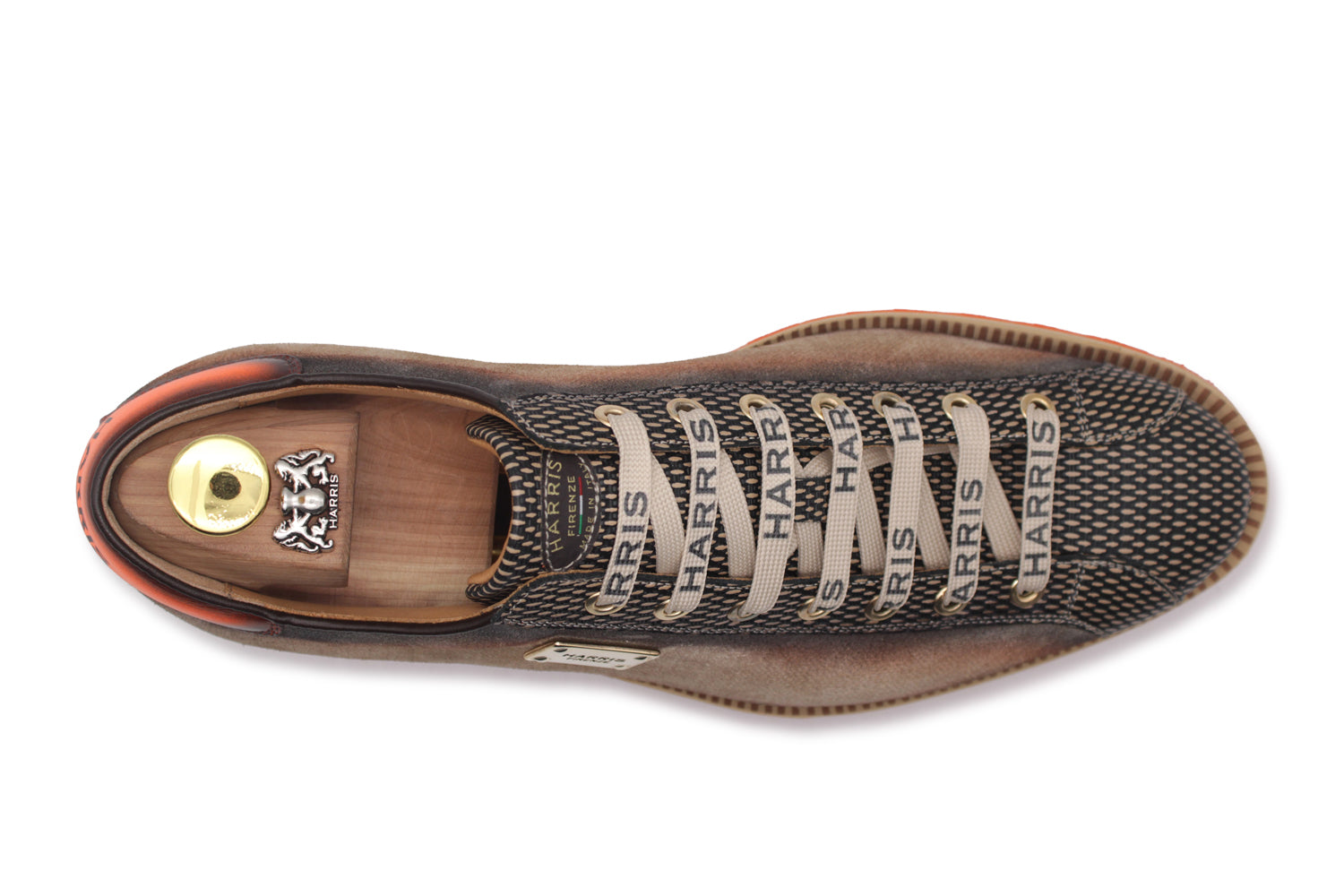L'eleganza tattile del suede stampato effetto tessuto incontra la precisione dei dettagli stampati, il tutto armonizzato da sapienti sfumature a mano. Impreziosita da accessori oro e completata da una suola runner in gomma, questa scarpa è dedicata a chi cerca una texture distintiva e una comodità senza compromessi.
