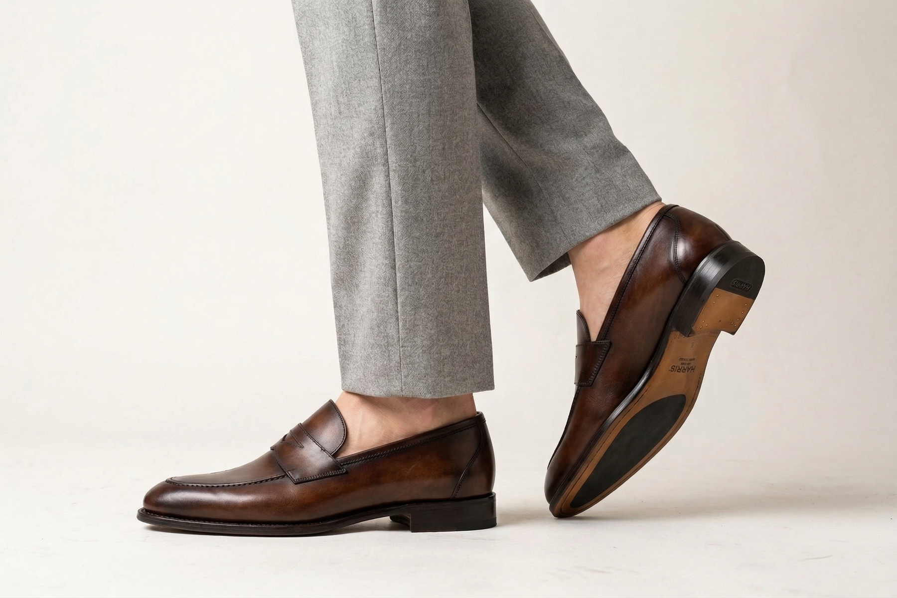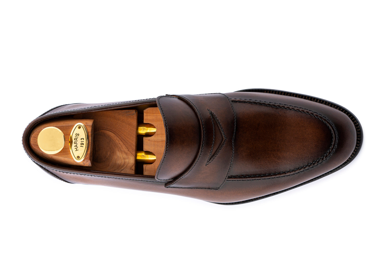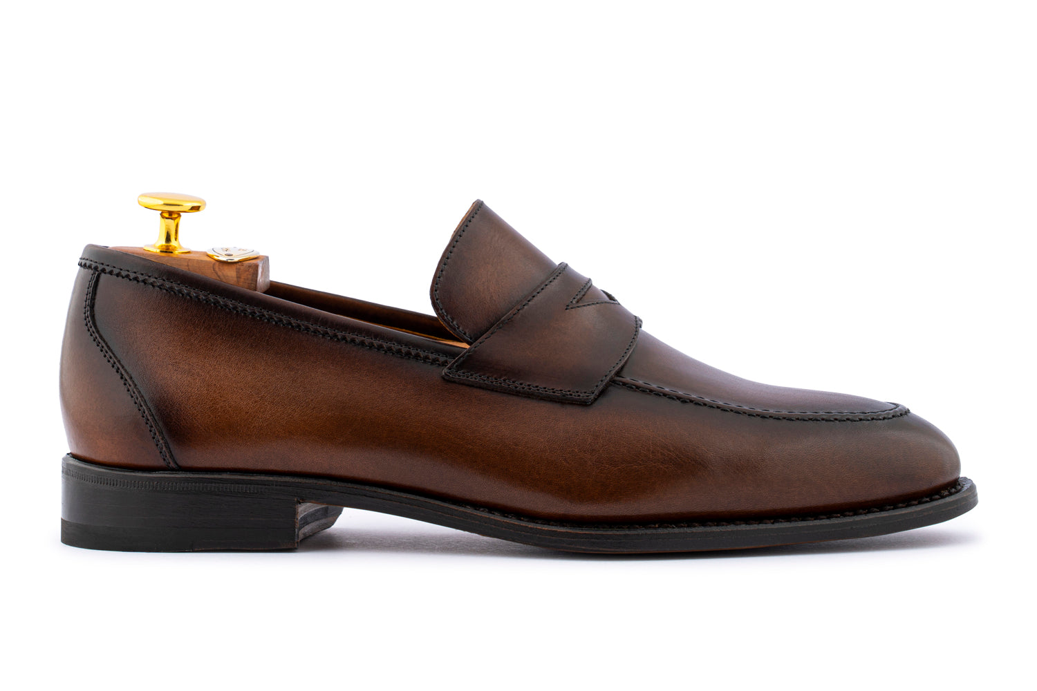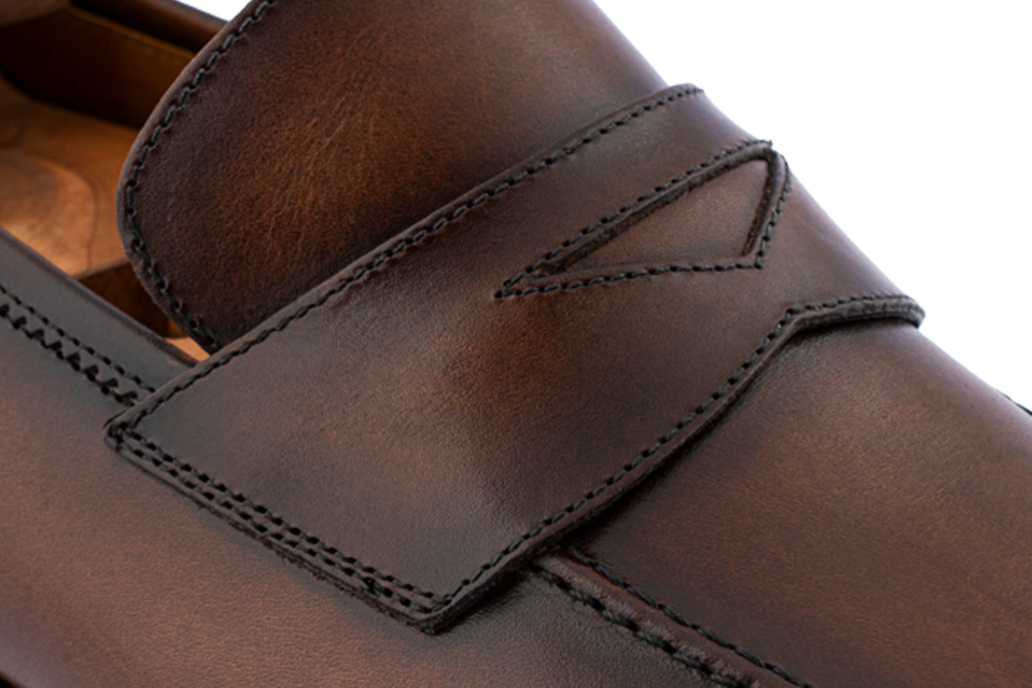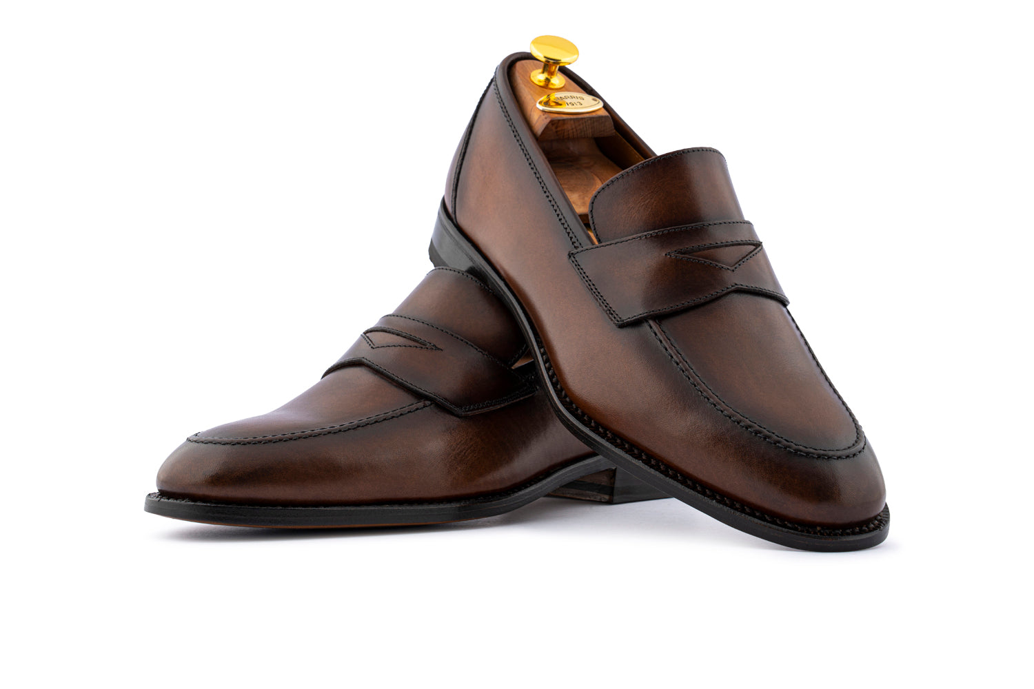 Pelle vegetale pieno fiore, anticata interamente a mano per un carattere unico. Dotato di passante in pelle e suola in cuoio con inserto antiscivolo, questo modello incarna l'eccellenza della lavorazione Blake Rapid.