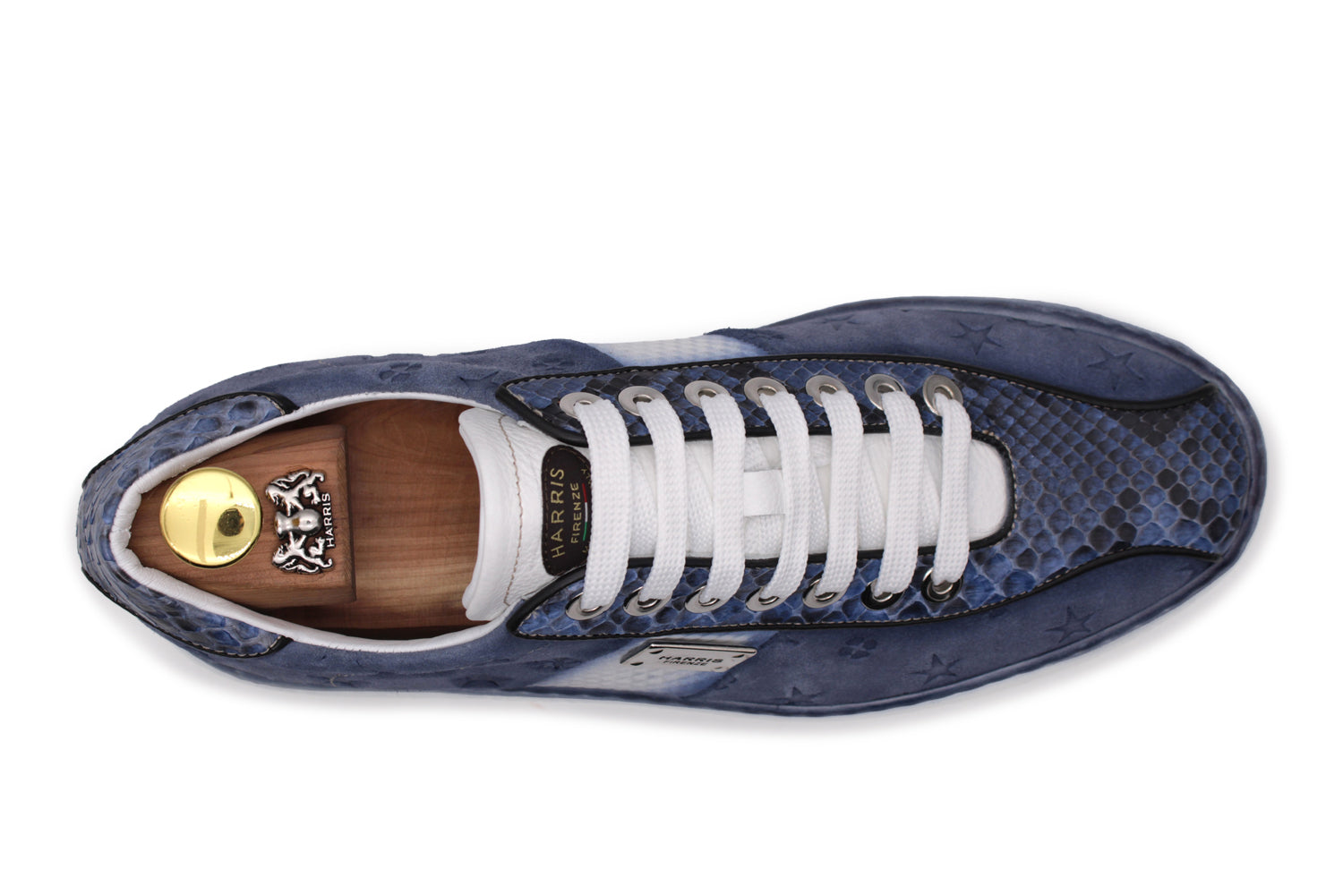 Il prestigio del brand si esprime nella pelle scamosciata stampata monogram Harris. Il tocco vibrante del pitone azzurro e i riporti sfumati creano un contrasto cromatico unico. Completata da accessori nichel e suola a cassetta, è la sintesi perfetta tra logomania e artigianalità.