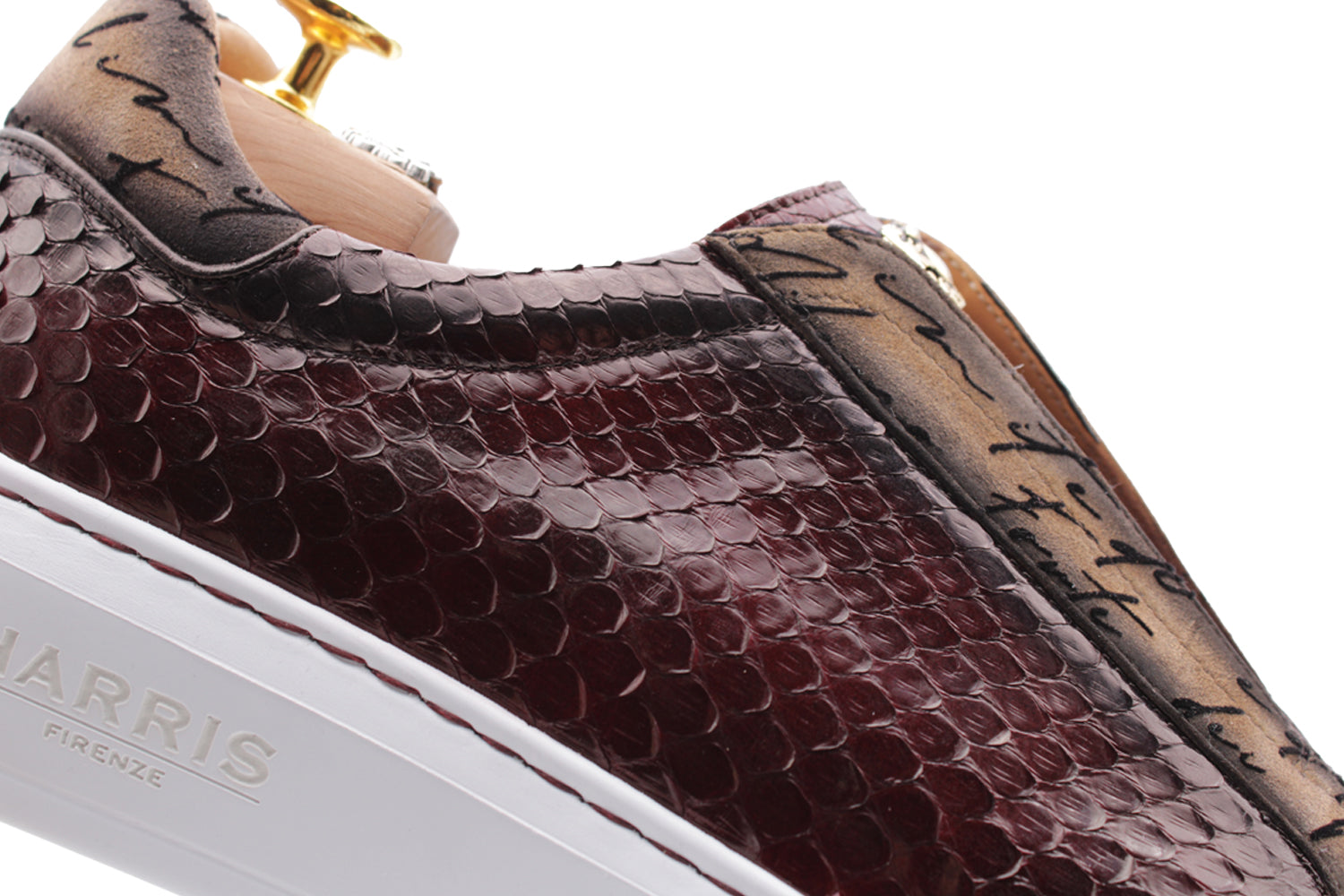 L'eleganza senza lo sforzo dei lacci. Una sneaker slip-on realizzata in pregiato pitone bordeaux con dettagli in suede writer. La suola a cassetta e la lavorazione Blake Rapid garantiscono flessibilità e una calzata superiore.
